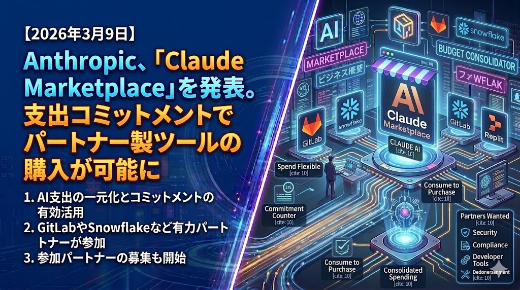 Anthropicは、同社のAIモデル「Claude」を活用した企業向けソフトウェアを提供する「Claude Marketplace」を発表した。 現在は限定プレビューとして提供されており、企業はAnthropicとの契約における支出コミットメント(利用確約額)の一部を、パートナー企業が開発したソリューションの購入や利用料に充てることが可能となる。