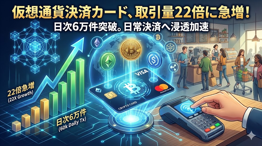 暗号資産(仮想通貨)決済カードの利用が、この1年余りで爆発的な成長を遂げている。ニュースメディア「The Block」の報道によると、2024年12月から2026年1月中旬にかけて、1日あたりの取引件数は22倍に急増し、約6万件に達した。
