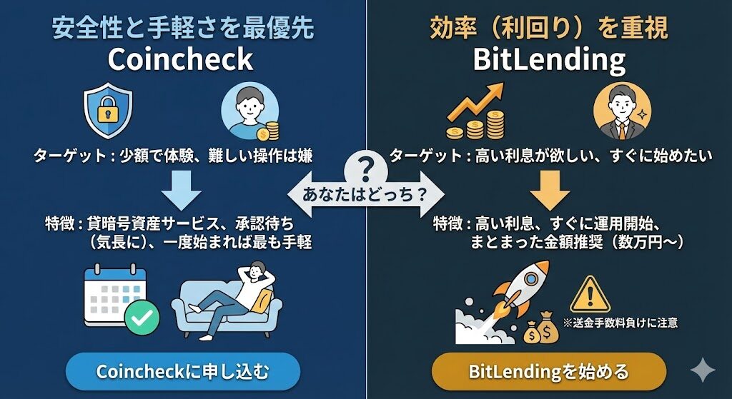 この記事では、国内サービスの代表格である「Coincheck(コインチェック)」と、高金利で注目を集める「BitLending(ビットレンディング)」を例に挙げ、それぞれの特徴と選び方を解説します。