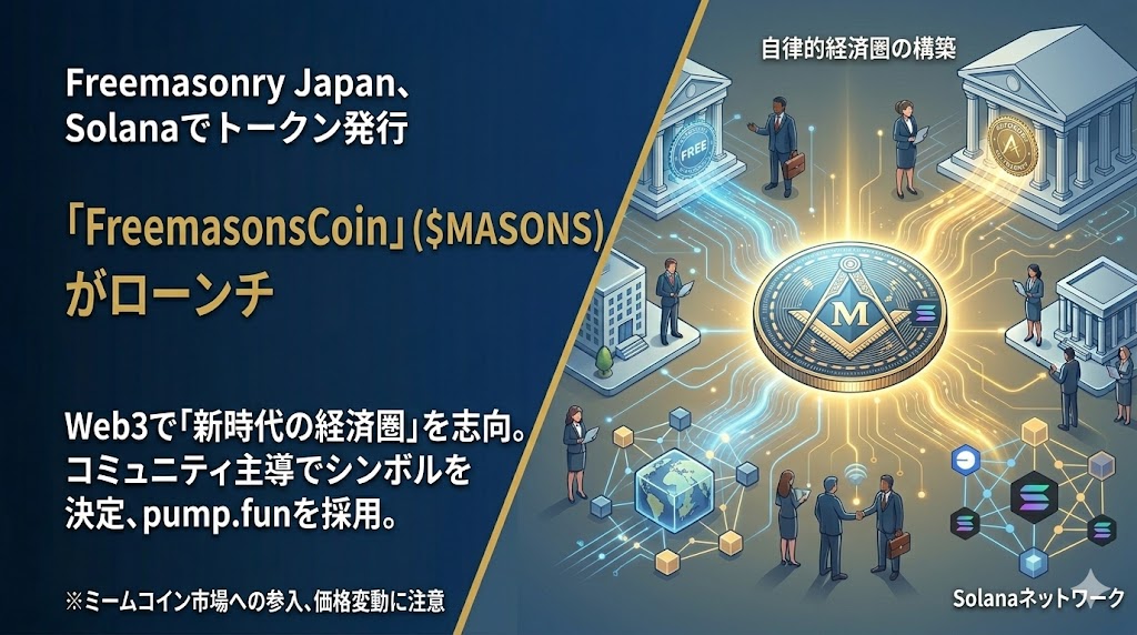 フリーメイソン日本は2日、Solanaブロックチェーンネットワーク上において、Xで独自トークン「FreemasonsCoin(ティッカー:$MASONS)」をローンチしたことを報告した。
