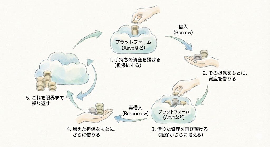 例えば、100万円分の資産しか持っていなくても、このループを繰り返すことで、計算上は200万円、300万円分の資産を「預けている」状態を作り出すことができます。