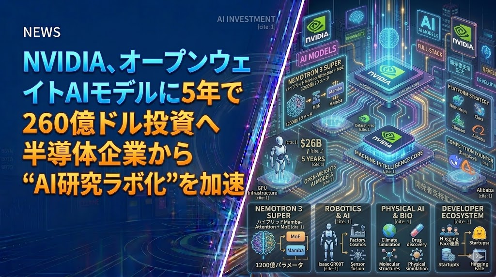 今回の260億ドル投資計画は、NVIDIAが「AIブームで最も儲かる半導体企業」という立場から、AIモデルそのものの競争にも正面から踏み込む意思を示したものといえる。オープンウェイト戦略を強めれば、開発者の支持を広げつつ、自社GPUやクラウド基盤への需要も押し上げやすい。生成AIの競争軸が、モデル、データ、推論基盤、開発者エコシステムを一体で握る方向へ進む中、NVIDIAはその中心を狙う構えをさらに鮮明にした。