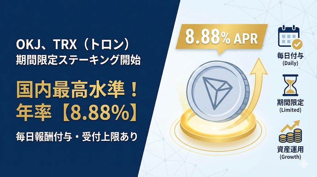 暗号資産取引所「OKJ(旧オーケーコイン・ジャパン)」を運営するオーケーコイン・ジャパン株式会社は12日、暗号資産**トロン(TRX)**を対象とした「期間限定ステーキングプラン」の提供を開始した。