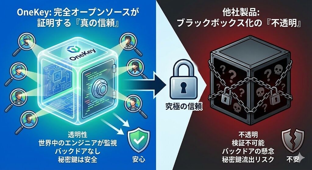 セキュリティ製品において最も重要なのは「信頼」です。OneKeyは、ハードウェアの設計図からソフトウェアのコードに至るまで、すべてを「オープンソース」として公開しています。