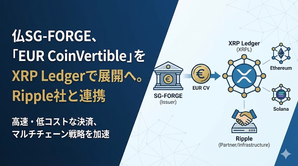 仏金融大手ソシエテ・ジェネラルのデジタル資産子会社であるSG-FORGEは18日、同社が発行するコンプライアンス準拠のユーロ連動型ステーブルコイン「EUR CoinVertible」を、XRP Ledger(XRPL)上でローンチしたと発表した。