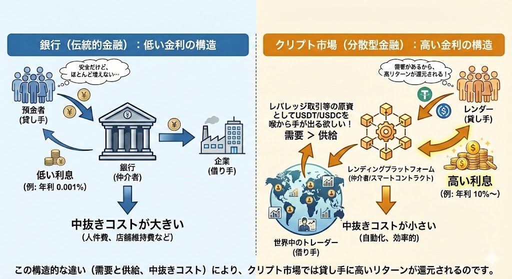 • クリプト市場:集めたお金を世界中のトレーダーに直接貸して、高い利息を得る(中抜きコストが小さい)