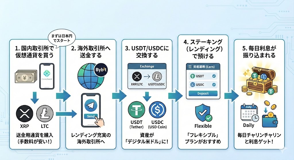 日本円を持っている状態から、ステーブルコイン運用を始めるまでの流れは以下の通りです。