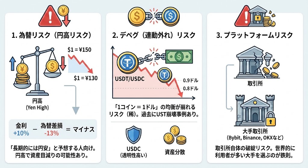 極めて稀ですが、発行会社の信用不安などにより「1コイン = 1ドル」の均衡が崩れ、0.9ドルや0.8ドルに暴落する可能性があります(過去にはUSTというコインが崩壊した事例があります)。 対策としては、USDTよりも透明性の高い「USDC」を選んだり、資産を分散させたりすることが重要です。
