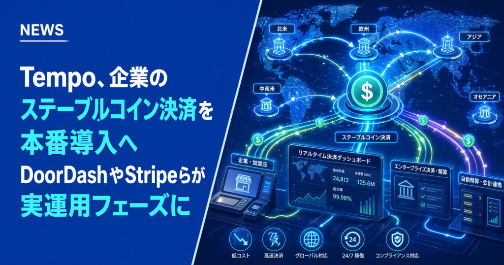 決済特化ブロックチェーン「Tempo」を運営するTempoは、企業パートナーがステーブルコイン決済フローを本番環境へ持ち込み始めていることを明らかにした。TempoのX投稿では、DoorDash、Stripe、Coastal Bank、ARQなどがTempo上で決済インフラを構築していると案内している。Tempoは3月にメインネットを公開したばかりで、今回の発信は「実証」から「実運用」への移行を印象づける内容となっている。